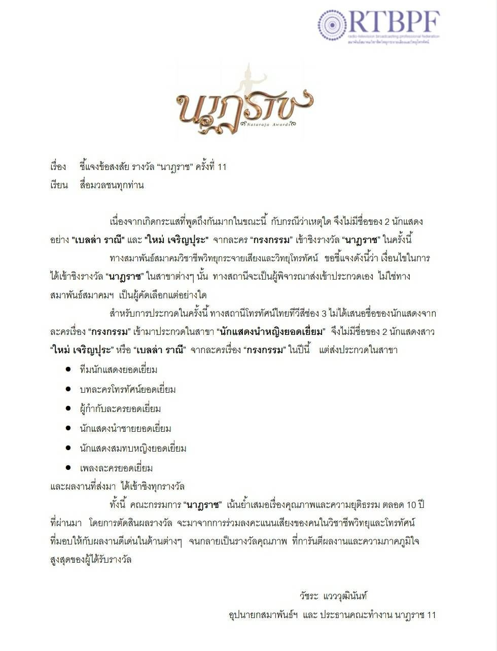 เกี่ยวกับเรื่องนี้สมาพันธ์สมาคมวิชาชีพวิทยุกระจายเสียงและวิทยุโทรทัศน์ ได้ออกจดหมายชี้แจงว่า เงื่อนไขในการประกวดรางวัลนาฎราช คือแต่ละสถานีจะเป็นผู้พิจารณาส่งรายชื่อเข้ามาพิจารณา ซึ่งในครั้งนี้ช่อง 3 ไม่ได้ส่งรายชื่อนักแสดงจากละครเรื่องดังกล่าวเข้าชิงในรางวัลนักแสดงนำหญิงยอดเยี่ยม แต่ส่งชิงในรางวัลอื่นๆ ซี่งก็ได้เข้าชิงทุกรางวัลตามที่ส่งมา