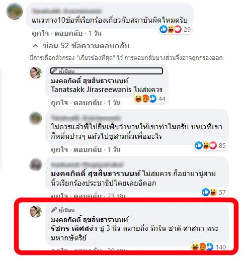 อย่างไรก็ตาม ในคอมเมนต์ของโพสต์ดังกล่าวมีผู้คอมเมนต์ถามนายมงคลกิตติ์ว่า นายมงคลกิตติ์เห็นด้วยกับข้อเรียกร้องของกลุ่มผู้ชุมนุมหรือไม่ นายมงคลกิตติ์ ตอบว่าไม่สมควร และเมื่อถามว่าไปชู 3 นิ้วทำไม นายมงคลกิตติ์ ตอบว่า ชู 3 นิ้วหมายถึง รักใน ชาติ ศาสนา พระมหากษัตริย์