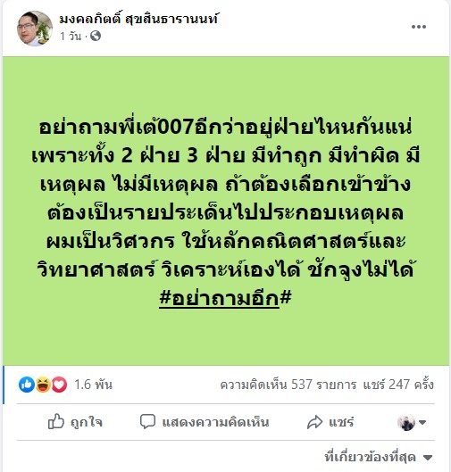 ข้อความระบุว่า “อย่าถามพี่เต้ 007 อีกว่าอยู่ฝ่ายไหนกันแน่เพราะทั้ง 2 ฝ่าย 3 ฝ่าย มีทำถูก มีทำผิด มีเหตุผล ไม่มีเหตุผล ถ้าต้องเลือกเข้าข้างต้องเป็นรายประเด็นไปประกอบเหตุผล ผมเป็นวิศวกร ใช้หลักคณิตศาสตร์และวิทยาศาสตร์ วิเคราะห์เองได้ ชักจูงไม่ได้ #อย่าถามอีก#”