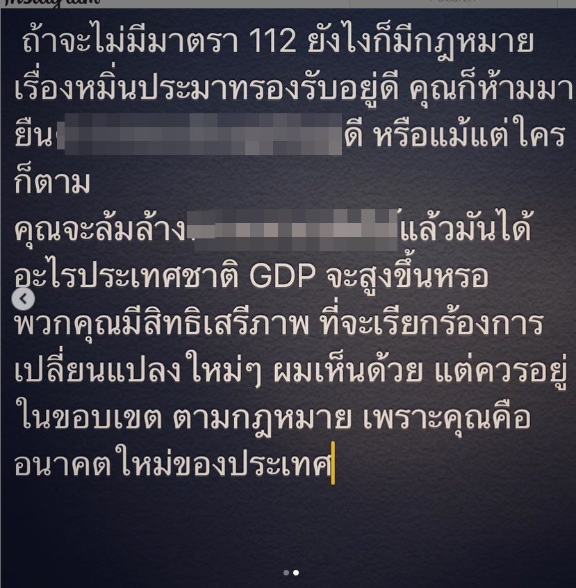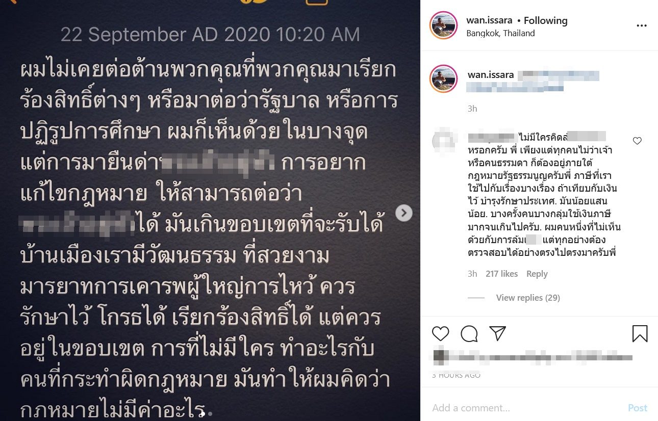 ทั้งนี้ล่าสุดเมื่อเวลา 10.20 น. วันที่ 22 ก.ย ปลาวาฬ ได้โพสต์ไอจี อีกครั้งเมื่อโดยระถึงเหตุผลที่วิพากษ์วิจารณ์การปราศรัยของม็อบ และไม่เห็นด้วยกับการชุมนุมที่มีการกล่าวถึงสถาบันฯ